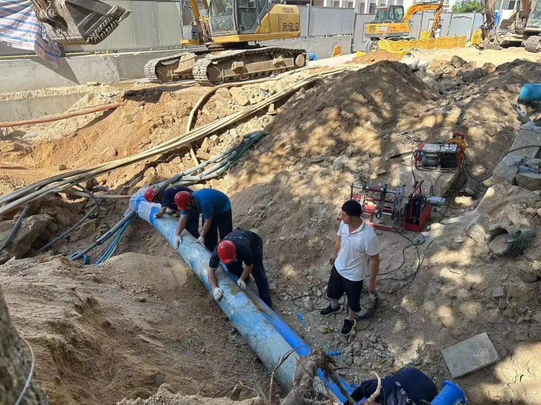7月21日施工当日,工程维修部全体维修师傅上午7点早早集结完毕,停水后,现场维修师傅们分工协作、有条不紊地开展工作:快速停水、认真切割、迅速排水、小心布管、精准热熔对接,争分夺秒完成管道迁移任务。