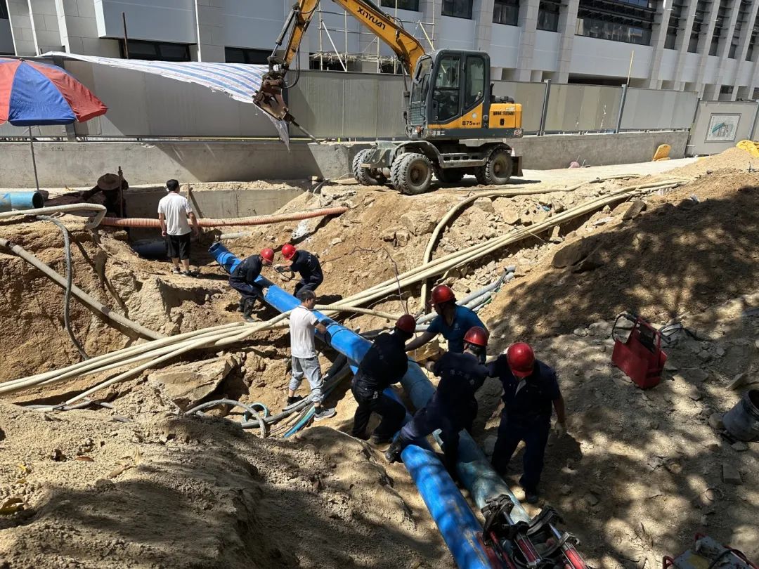 工程维修部严格落实“5D管理”施工规范,7月20日,提前做好施工准备工作,布置安全防护设备,现场检查管沟预设情况并测量确定水管的安全走向,同时与各相关单位沟通协商、确定停水时段,尽量把停水造成的影响降到最小。