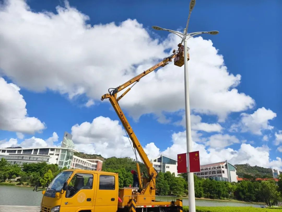 为了这场毕业盛典,漳州校区水电维修部全体水电师傅们克服时间紧任务重,顶烈日战高温抢进度,连续奋战5天,共计安装临时电缆5条756米;音控台、直播车、面光灯、投光灯等临时电源10路500余米;安装加固6米临时灯杆12支;安装2000W投光灯19盏;主席台安装200W射灯26盏、田径场安装彩带灯400米;安装氛围投影照明11盏,用坚韧和汗水扮亮了毕业典礼的璀璨夜晚,得到嘉庚学院校领导的赞扬与认可。