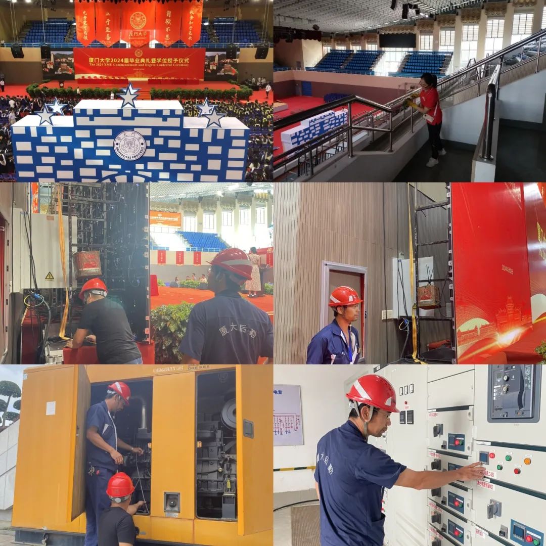 服务办各部门通力协作,校园服务部做好毕业典礼会场布置、环境卫生保洁等各项服务保障工作。水电管理部提前准备发电车,并对发电车进行检查、试启动,保证备用电源的供电可靠性,安排人员对毕业典礼现场的电源进行溯源,对上端电源点进行安全巡查,了解用电情况,确保典礼当天各项设施设备运行正常。