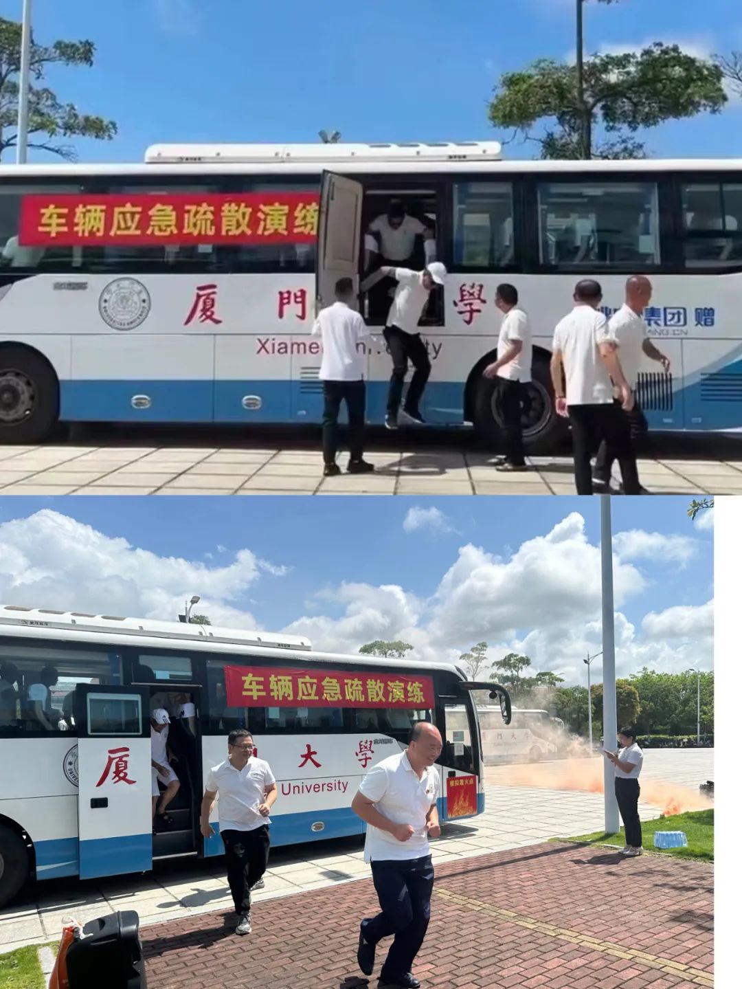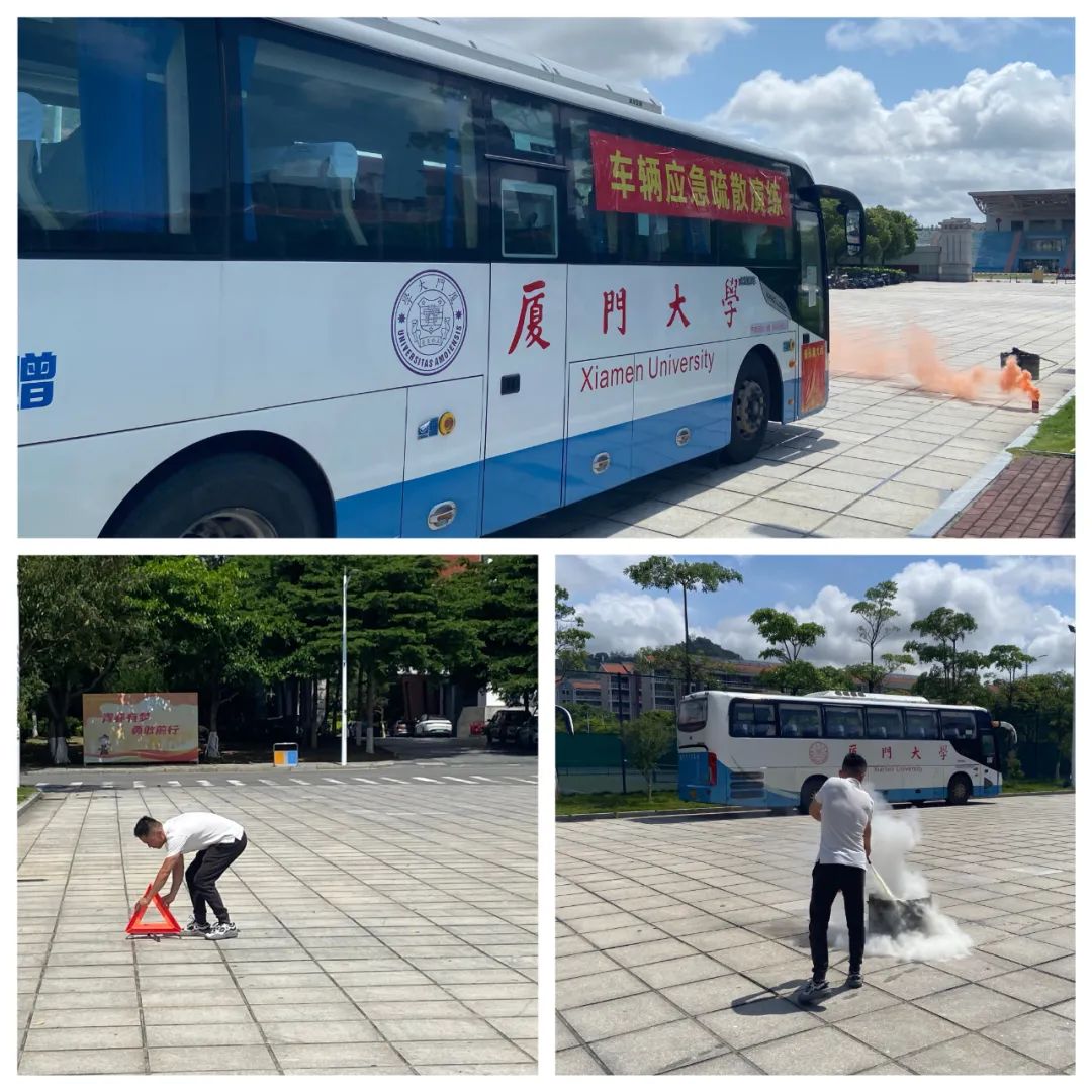 现场随着集团总经理助理兼翔安校区服务办主任汪尚谦的一声令下,演练开始,一辆大巴车在行驶途中突发火情,车内冒起浓烟,驾驶员迅速启动应急预案,紧急靠边停车熄火,组织乘客有条不紊地进行疏散,并立即摆放三角警示牌,进行灭火、报警等操作,整个演练过程紧张有序,取得了预期效果。