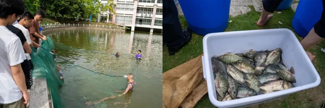 一年一度的鱼宴由老师同学们齐心协力,从校内湖中捕获最鲜美的食材。