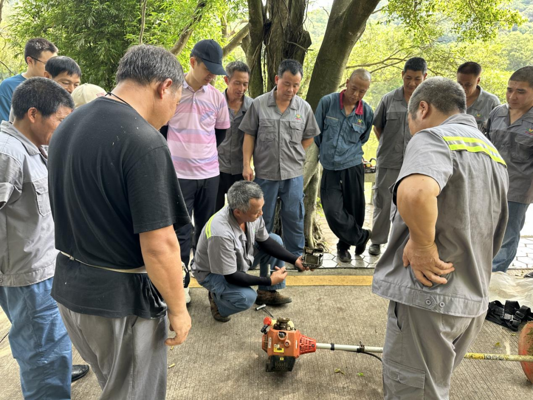油锯、绿篱机、打草机是绿化养护中常用的机械,作为绿化养护人员,必须具备基础的绿化机械保养及维修的技能,才能保障绿化养护工作有序开展。在培训中,绿化骨干作为师傅为绿化员工讲解并示范了常用绿化机械的保养、简单维修以及规范操作的要点。参训的绿化员工认真听讲,不时向师傅发问,请教工作中遇到的实际难题,师傅也给予了耐心解答。