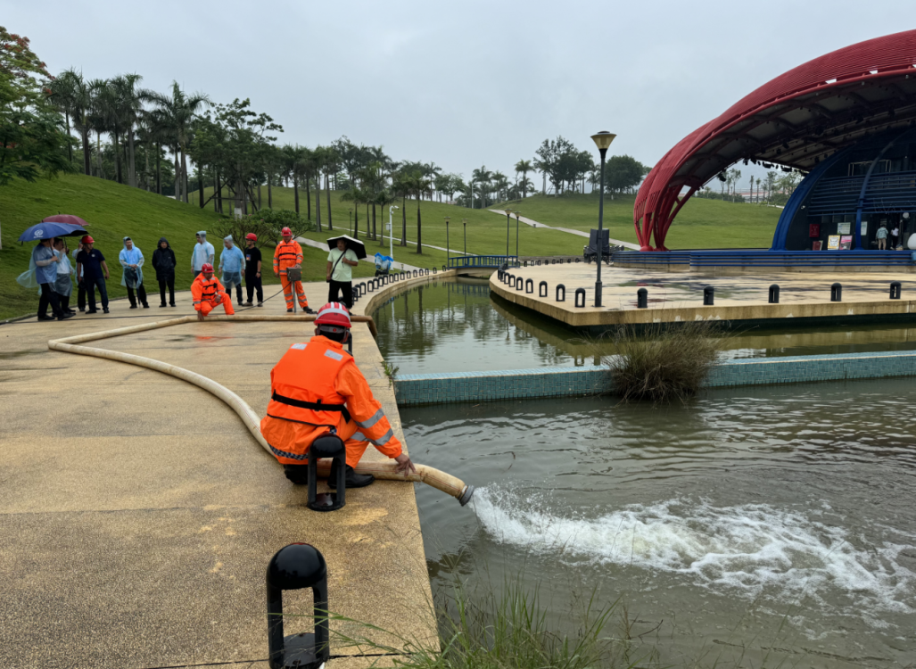 水电管理部模拟因连日暴雨影响,学生音乐广场排涝应急抢险演练。水电防汛抢险应急队迅速集结完毕,分组分工作业,奔赴现场进行抽水排涝,确保了现场汛情及时得到处置。