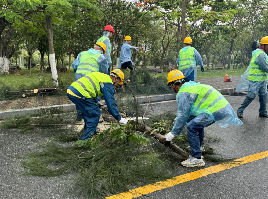 在学生广场路口,校园服务部模拟了道路倒伏树木清障应急演练。抢险人员第一时间设置好路障、疏散人群,有条不紊地检查各类应急设备,齐心协力疏通道路,快速对倒伏树木采取切割、搬移等现场清障处置措施,确保了道路尽快恢复通畅。