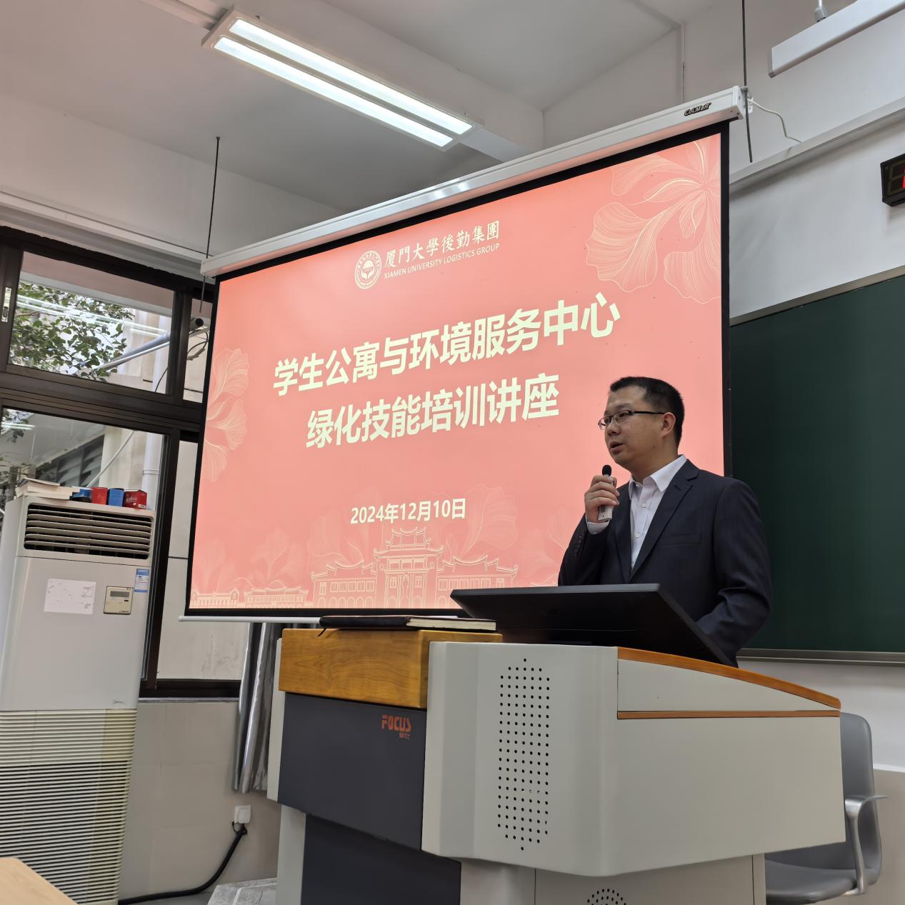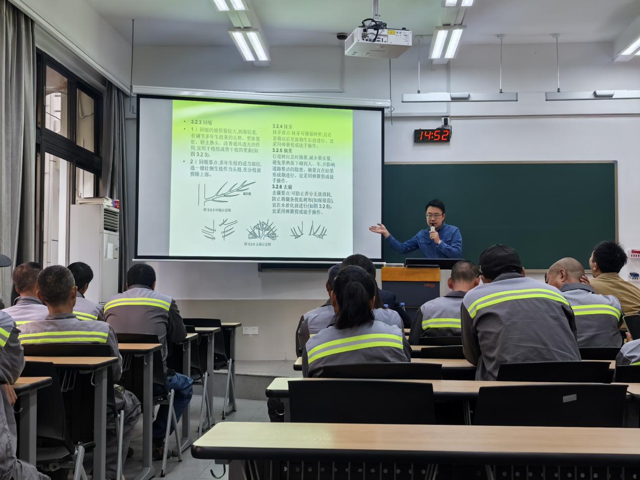 为进一步提高员工日常业务技能,提升校园绿化养护管理水平,打造美丽校园绿化环境,12月10日下午,学生公寓与环境服务中心绿化保洁部组织开展了常见园林植物修剪与病虫害防治专项培训。本次培训特别邀请到了厦门市园林植物园的绿化专家吴剑龙老师进行授课,部门42名员工参加了培训,资产与后勤事务管理处事务科科长吴熹到场指导。