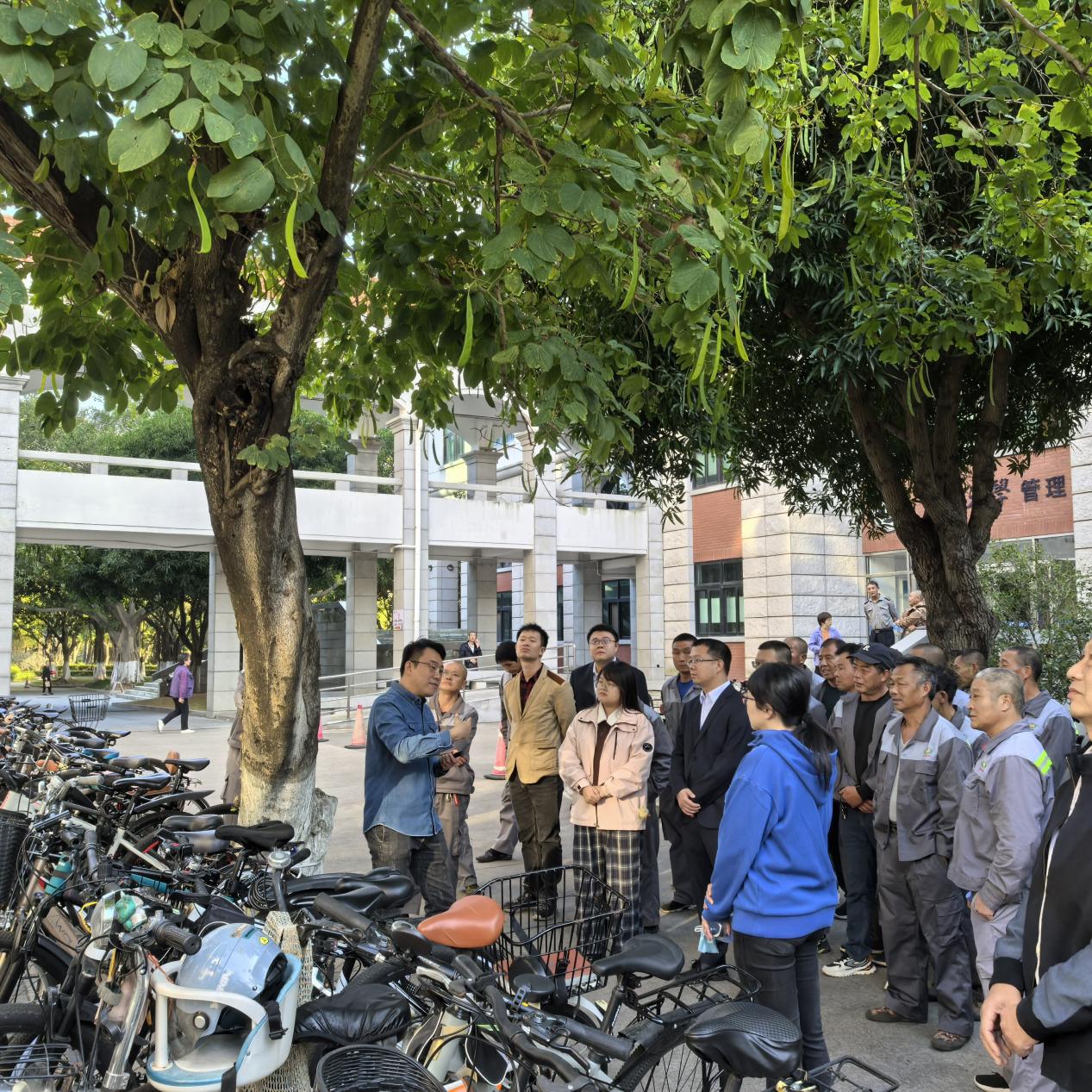 为了巩固理论学习成果,让理论知识能够迅速转化为实际操作技能,吴老师在培训后带领全体参与人员前往嘉庚一楼附近,对芒果树和羊蹄甲进行现场实操教学,并通过大量实例介绍了校园植物修剪方法和病虫害防治技巧,就如何提升校园环境绿化美化质量和水平提出了诸多建设性意见。