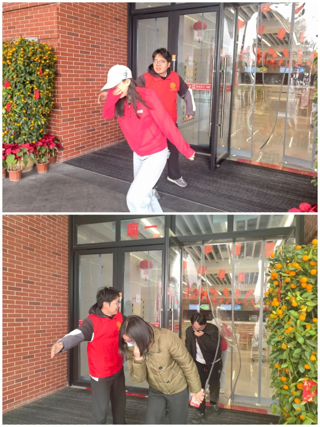 随着火灾警报响起,在餐厅一楼,身穿红色志愿者马甲的党员们迅速分散开来,有的第一时间冲向各个出入口,确认疏散通道畅通无阻;有的大声呼喊,提醒餐厅内的师生用毛巾或衣物捂住口鼻,弯腰快步前行,在他们的镇定指挥下,人群有序地朝着安全区域快速移动。