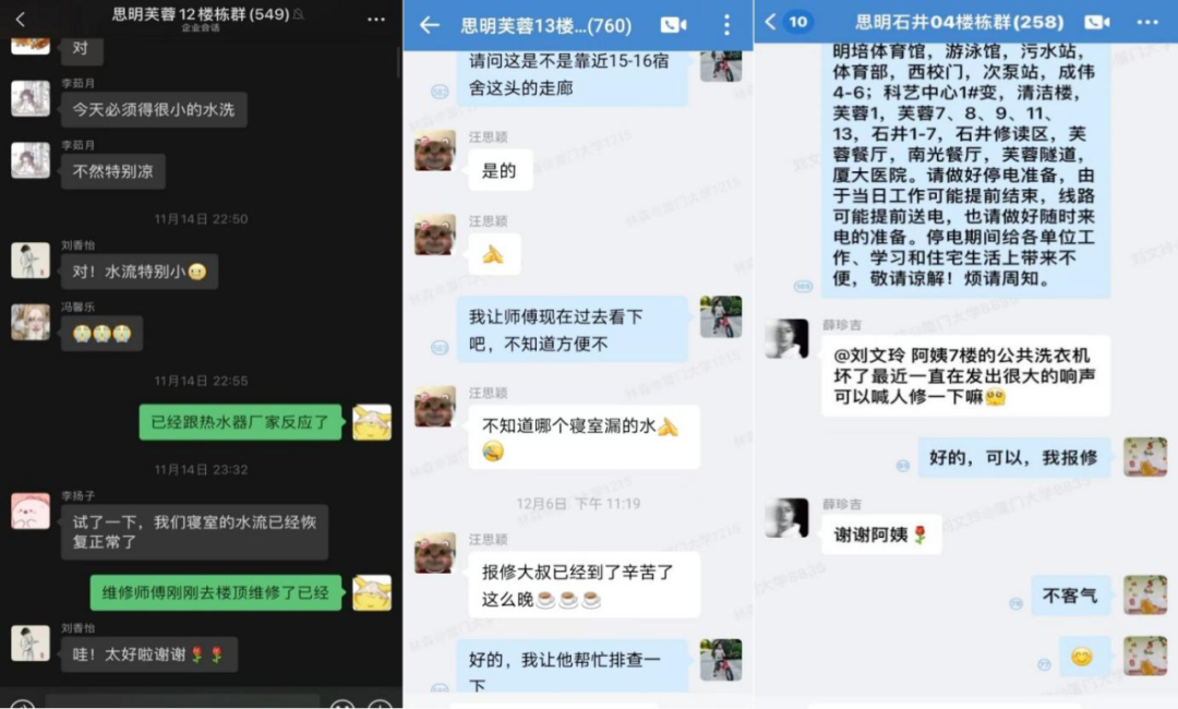 2024年,为切实解决学生“急难愁盼”的生活问题,部门依托厦门大学公寓办建立的学生公寓楼栋企业微信群,推进“物业微管家”服务,拓宽宿舍管理人员与学生的沟通渠道,时刻关注学生需求,倾听学生心声,努力将“句句有回应,事事有着落”做实做到位,全力为学生提供安全舒适、干净整洁的生活环境。