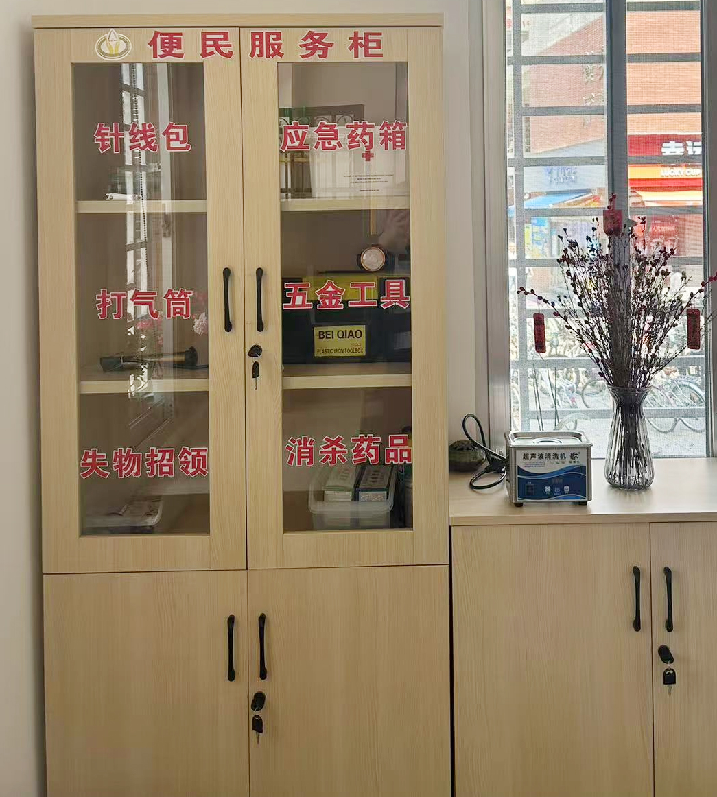 便民服务站虽小却“五脏俱全”,不仅配备了爱心伞、打气筒、体重秤、应急药箱、手推车,还有方便同学动手维修的小工具及缝补衣物的针线盒等。此外,为满足学生日常药品冷藏储存需求,服务站还专门设置了药品冷藏柜。