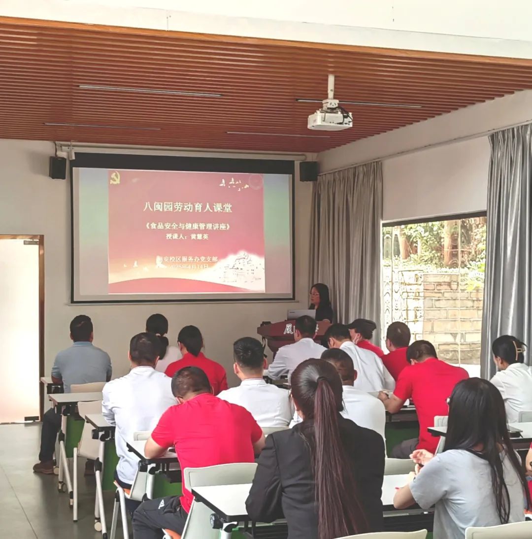在深入学习践行习近平新时代中国特色社会主义思想的过程中,翔安校区服务办党支部积极响应国家“健康中国”战略号召,聚焦党建与业务融合。2025年4月14日,依托翔安校区八闽园,邀请厦门大学生命科学学院分析测试中心的黄慧英老师,为支部党员与业务骨干带来以“食品安全与健康”为主题的讲座,旨在筑牢校园健康防线,以知识赋能后勤服务高质量发展。