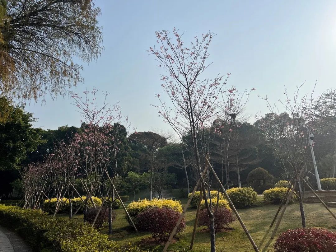 这样既能防止黑天鹅上岛,又能将行人与湖体隔离,形成一道绿色的安全屏障;在芙蓉湖圆形广场附近,通过移栽原有可用灌木球至适宜区域的做法,既优化了绿地布局,又节约了成本;同时为迎接校庆,特新栽种了红粉佳人樱及日本晚樱,形成季节特色景观。