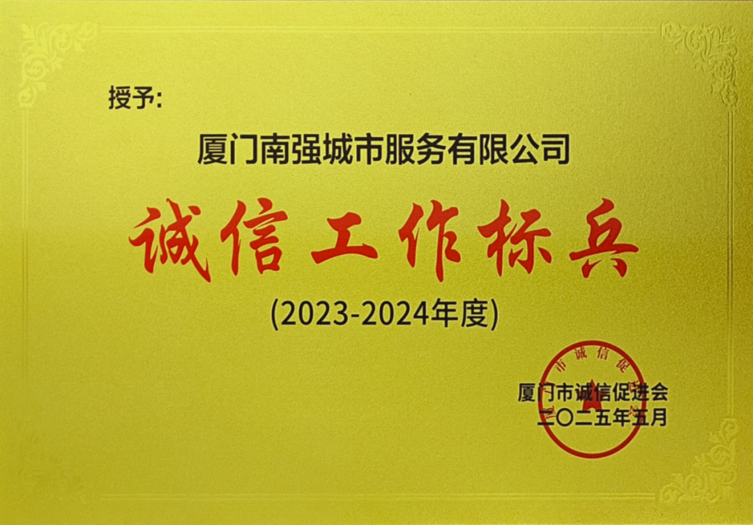 5月14日,厦门南强城市服务有限公司(以下简称“南强城服”)被厦门市诚信促进会授予“2023-2024年度诚信工作标兵”荣誉称号。