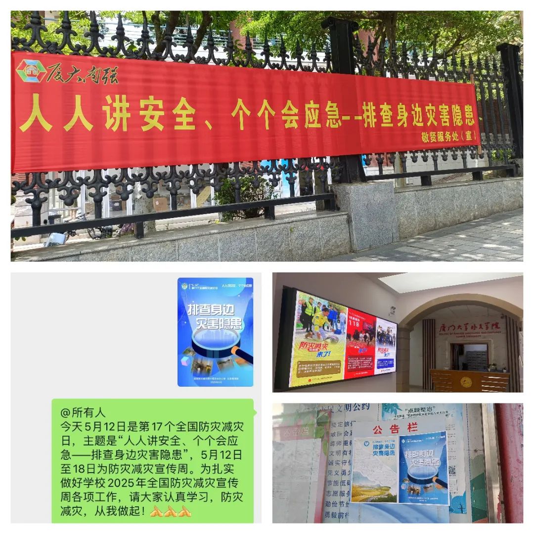 5月12日至18日期间,厦门南强城市服务有限公司(以下简称“南强城服”)积极响应号召,深入贯彻落实《厦门大学2025年防灾减灾宣传周活动实施方案》,以“人人讲安全、个个会应急——排查身边灾害隐患”为主题,开展了一系列形式丰富、扎实有效的防灾减灾宣传教育与应急演练活动,筑牢安全防线。