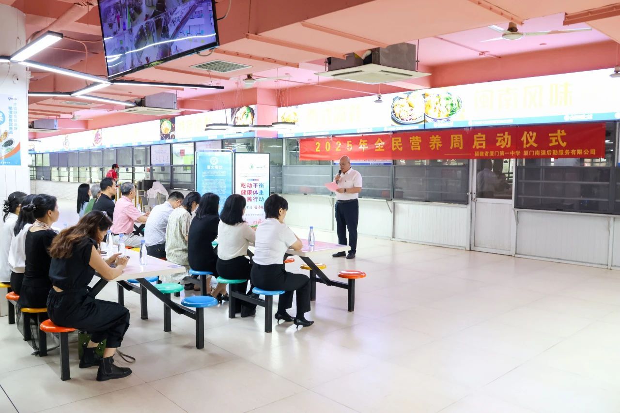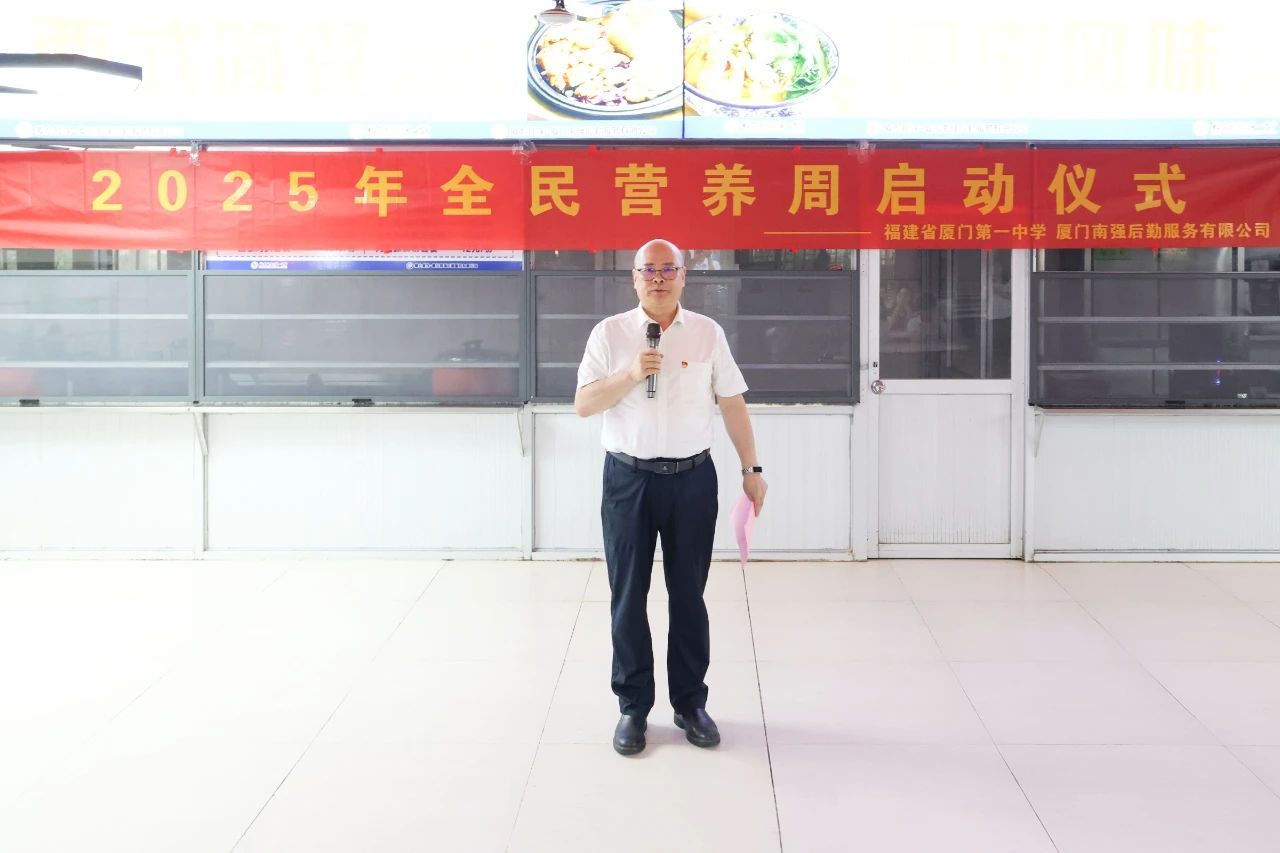 5月19日上午,厦门南强后勤服务有限公司2025年“全民营养周”启动仪式在厦门一中高中部餐厅成功举办!本次活动邀请了厦门市营养师协会、厦门市疾控中心、厦门第一中学保健教师等到场指导,公司班子成员以及党团组织代表、餐厅管理骨干共同参与。启动仪式由公司党支部书记兼副总经理高美芸主持。