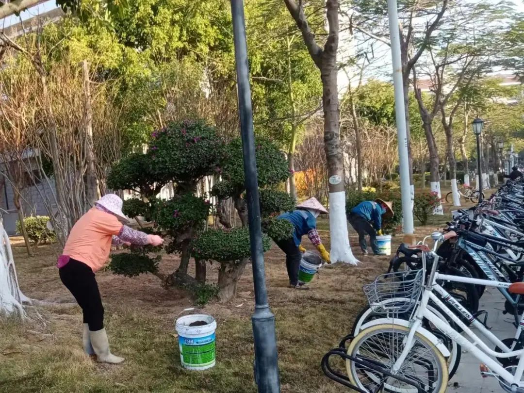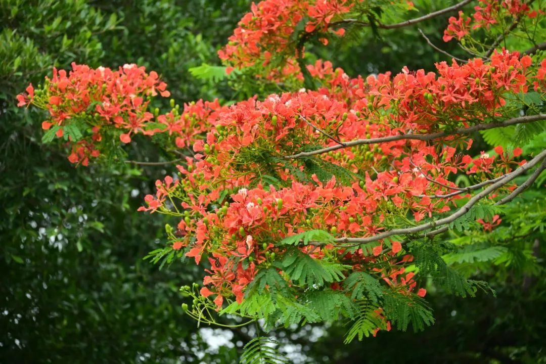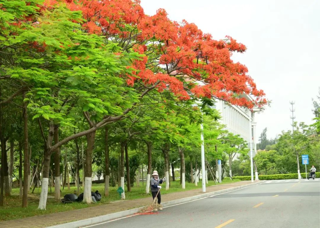 除了日常清扫,凤凰树的养护工作更是精细活儿。早在年初,绿化团队就开始为凤凰树“加餐”,每株树都要施下复合肥,同时进行修枝整形。而在花期来临前,他们还要密切监测树木生长情况,进行病虫害的预防性喷洒,保护花朵健康盛放。