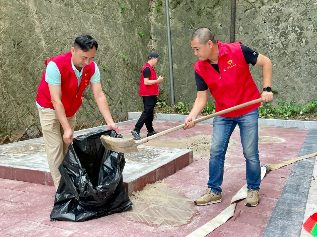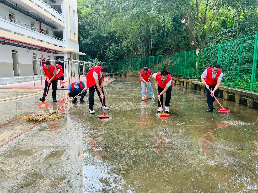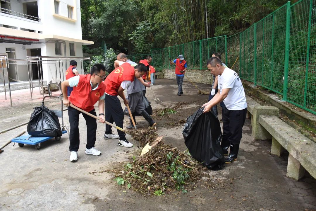“外围环境攻坚”突击队:面对宿舍楼前后广场及公共区域的装修遗留垃圾,这支队伍迎难而上。一组党员戴上手套,深入卫生死角,徒手清理枯枝杂物,挥铲清除积沙,耐心细致地铲除墙角顽固污渍;另一组党员操作高压水枪,对地面污垢进行强力冲刷,其他队员紧随其后,用地板刷奋力刷洗。在党员同志们不畏脏累、连续作战的努力下,顽固污渍被彻底清除,灰褐地砖重现本色,公共区域恢复了开阔整洁的面貌。虽然汗水浸透了红马甲,却更加彰显了党员同志们吃苦在前、甘于奉献的先锋本色。