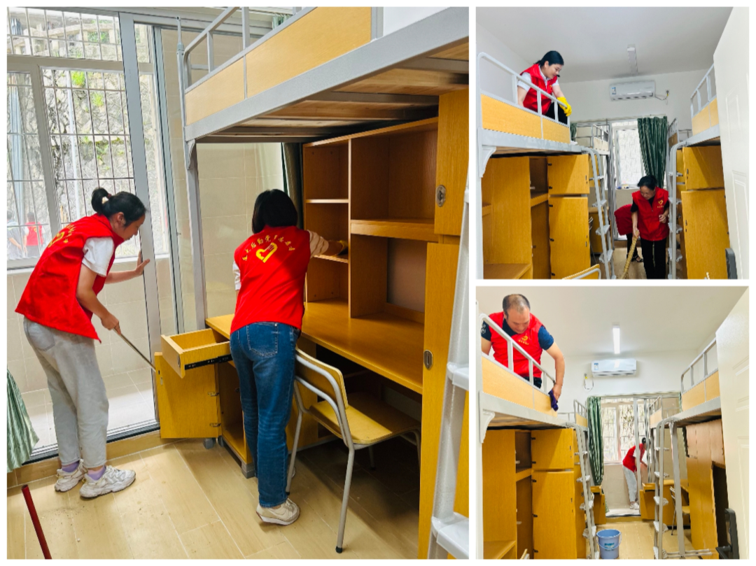 “宿舍美容师”突击队:队员们每三人组成一小组,分工协作,深入学生宿舍内部精细作业。“门窗玻璃要透亮如镜,家具边角不留死角!”“学生来到宿舍,看到干干净净的环境,心情该有多舒畅”。党员同志们一边示范,一边严格要求。有的俯身细致擦拭桌椅柜面,确保一尘不染;有的认真清扫地面,不留积尘;有的爬高擦拭床板,消除卫生盲区。在党员的示范引领下,宿舍环境迅速焕然一新:家具光洁锃亮,地面洁净如洗,阳光透过明亮的玻璃洒满房间,“家”的温馨舒适感油然而生,生动诠释了“服务育人”的宗旨。
