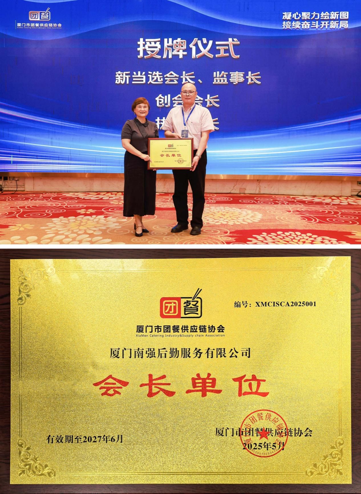 厦门南强后勤服务有限公司当选新一届厦门市团餐供应链协会会长单位,公司总经理罗阳当选新一届协会会长。