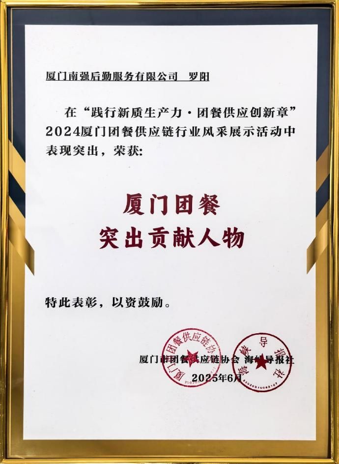 厦门南强后勤服务有限公司总经理罗阳在海峡导报社、厦门市团餐供应链协会主办的“践行新质生产力·团餐供应创新章”2024厦门团餐供应链行业风采展示活动中表现突出,荣获“厦门团餐突出贡献人物”。