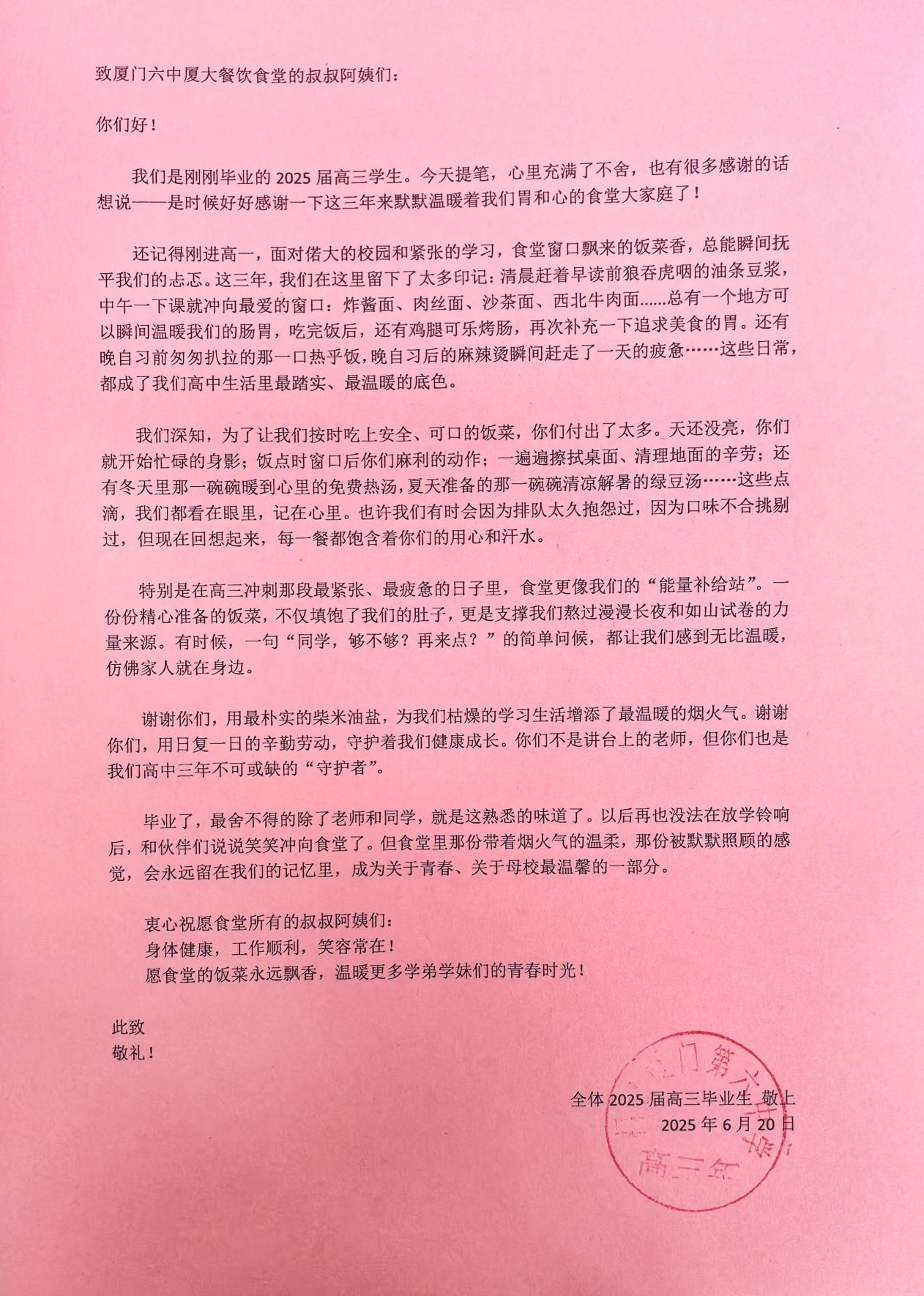 福建省厦门第六中学2025届高三毕业生给公司发来感谢信