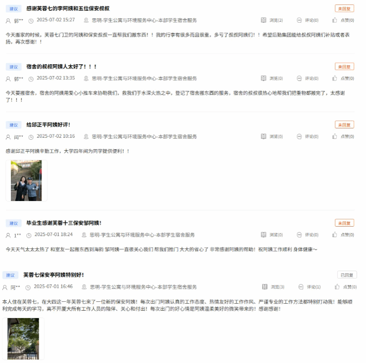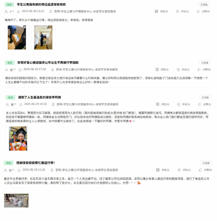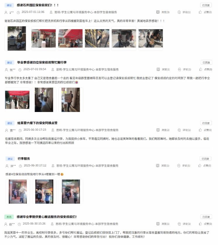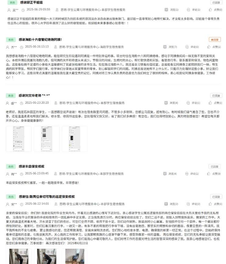 近日,多名毕业生在后勤服务监管平台发布表扬帖,对后勤员工的辛勤付出表达了最诚挚的感谢与敬意。