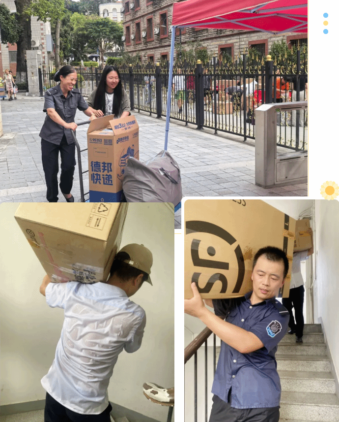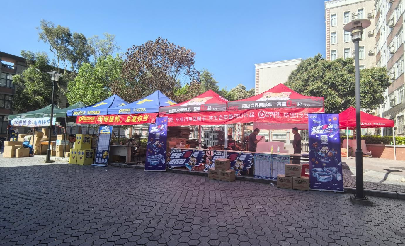 为方便毕业生办理行李托运,减轻其离校负担,邮政服务部提前联系邮政、顺丰、德邦等快递公司入驻校内,并在各园区门口设点,提供一站式行李打包、托运服务,确保毕业生离校时,行李能够高效便捷地托运。
