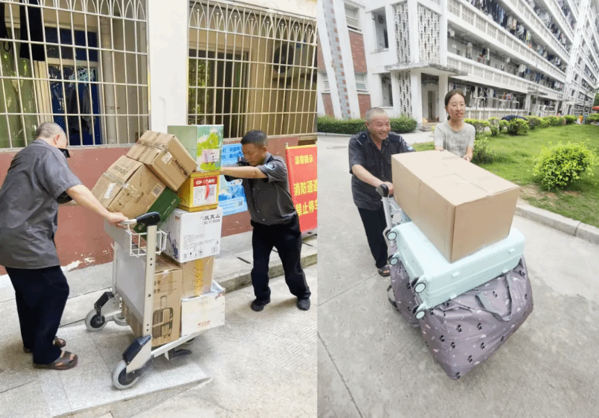 毕业季,既有离别之绪,也有感恩之情。“我的行李有很多而且很重,多亏了叔叔阿姨们!”“这么炎热的天气,真的非常辛苦!”……