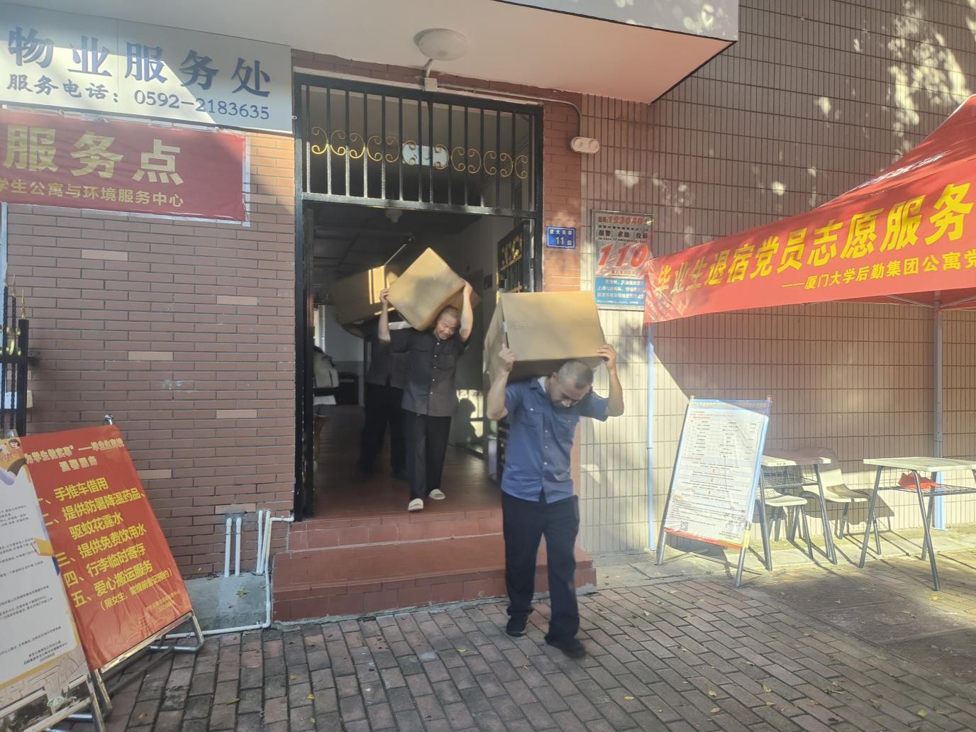 学生公寓服务部和海韵物业部分别组建了一支行李搬运爱心志愿服务队,帮助有需要的女生搬运行李。毕业生离校期间,队员们累计帮助毕业生502人次,共搬运行李2229件。队员们挥汗如雨的身影成为毕业季一道独特的风景线,传递着厦大后勤人最真挚、最实在的关怀。
