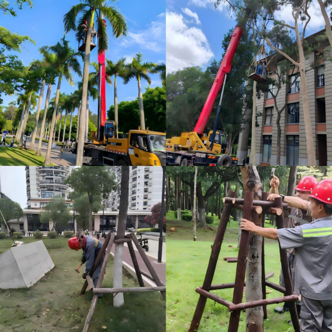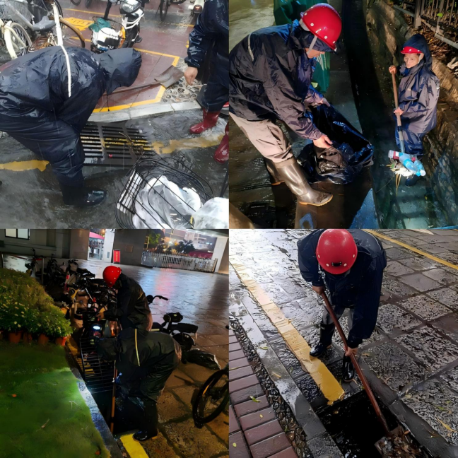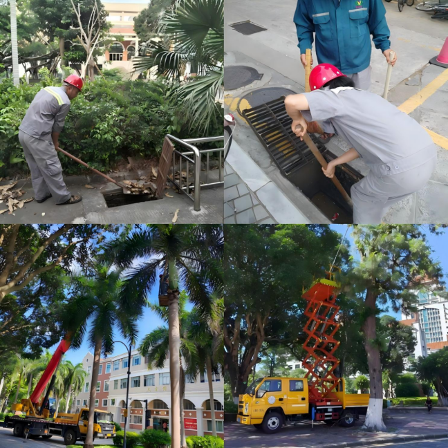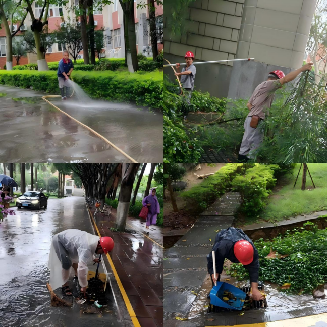 接到台风预警信息后,绿化保洁部全员进入“战备状态”,各班组分工协作,疏通排水管道内淤泥、树叶等堆积物,对核心主干道、图书馆、教学楼等重点区域周边实施“专人盯防”,每2小时巡查一次,确保排水通畅。同时对校内树木进行修剪疏枝、支撑加固,增加树木的抗风性,降低倒伏风险。