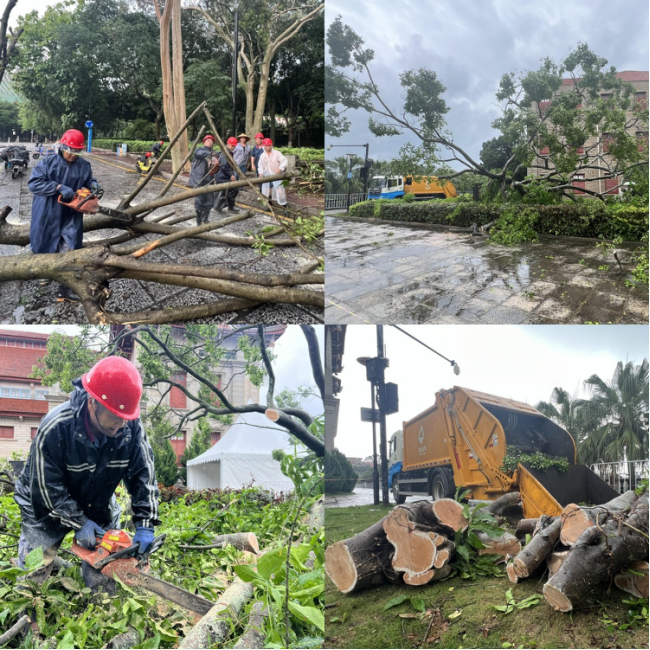 绿化保洁部高效推进台风后校园环境恢复工作,组织人员对校园主干道进行全面清淤和冲洗,清理路面断枝残叶,迅速恢复校园往日的整洁与美观。