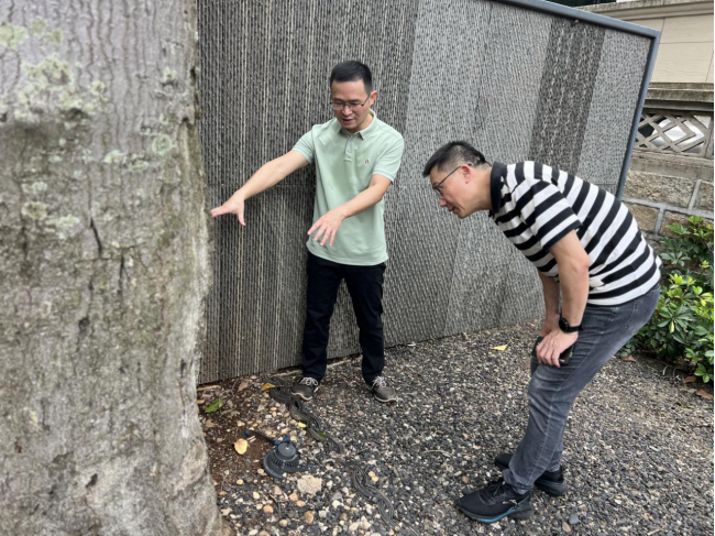 夏季高温高湿,绿化树木病虫害增多,台风来临时容易出现树木倒伏等情况。为此,7月14日,集团与资产处共同开展树木安全隐患联合巡查,对校内多处隐患树木点进行实地查看,围绕树木的根系腐烂、白蚁腐蚀防治、危树修剪及清理等进行讨论研究。