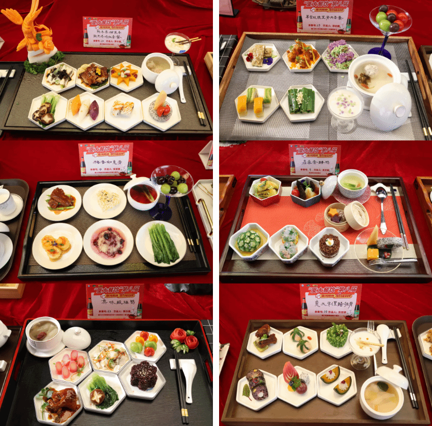 竞赛以营养团餐为主题,选手们现场抽取2种主荤食材进行比赛。在规定的时间内,每位选手手脑结合,脑中不停构思菜品创意,手下不断对食材进行操作,展现出精湛的厨艺和出色的创新能力。他们将食材与文化巧妙融合,营养与口味精心搭配,制作出一道道色香味俱佳的营养餐,让大家享受了一场视觉与味觉双重盛宴。