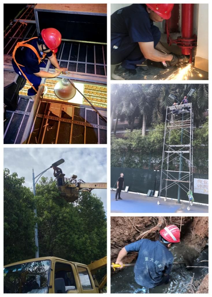▲各部门全面排查隐患,检修校园高杆灯、庭院灯等公共区域照明设施,抢修恢复漏水管道、更换阀门等。