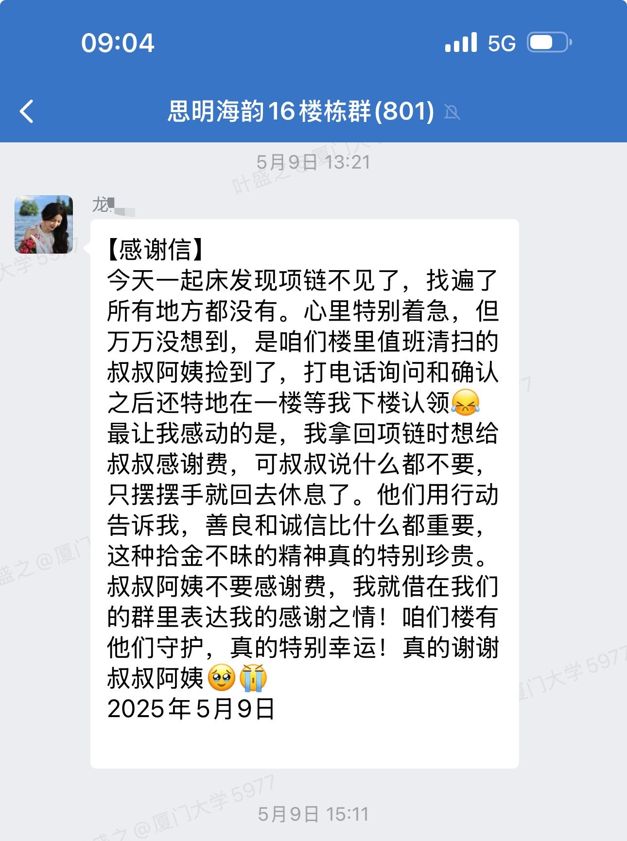 事情要回溯到5月9日上午8点左右,陈银贵、蓝添娣夫妇在日常保洁时,于盥洗室内捡到一条学生遗失的金项链。面对贵重物品,他们没有丝毫犹豫,第一时间主动上交至部门。部门随即按照失物招领预案启动流程,寻找失主。中午11时许,失主龙同学通过电话联系上陈银贵,经过仔细的信息核对与描述比对,确认失主身份后,项链顺利物归原主。