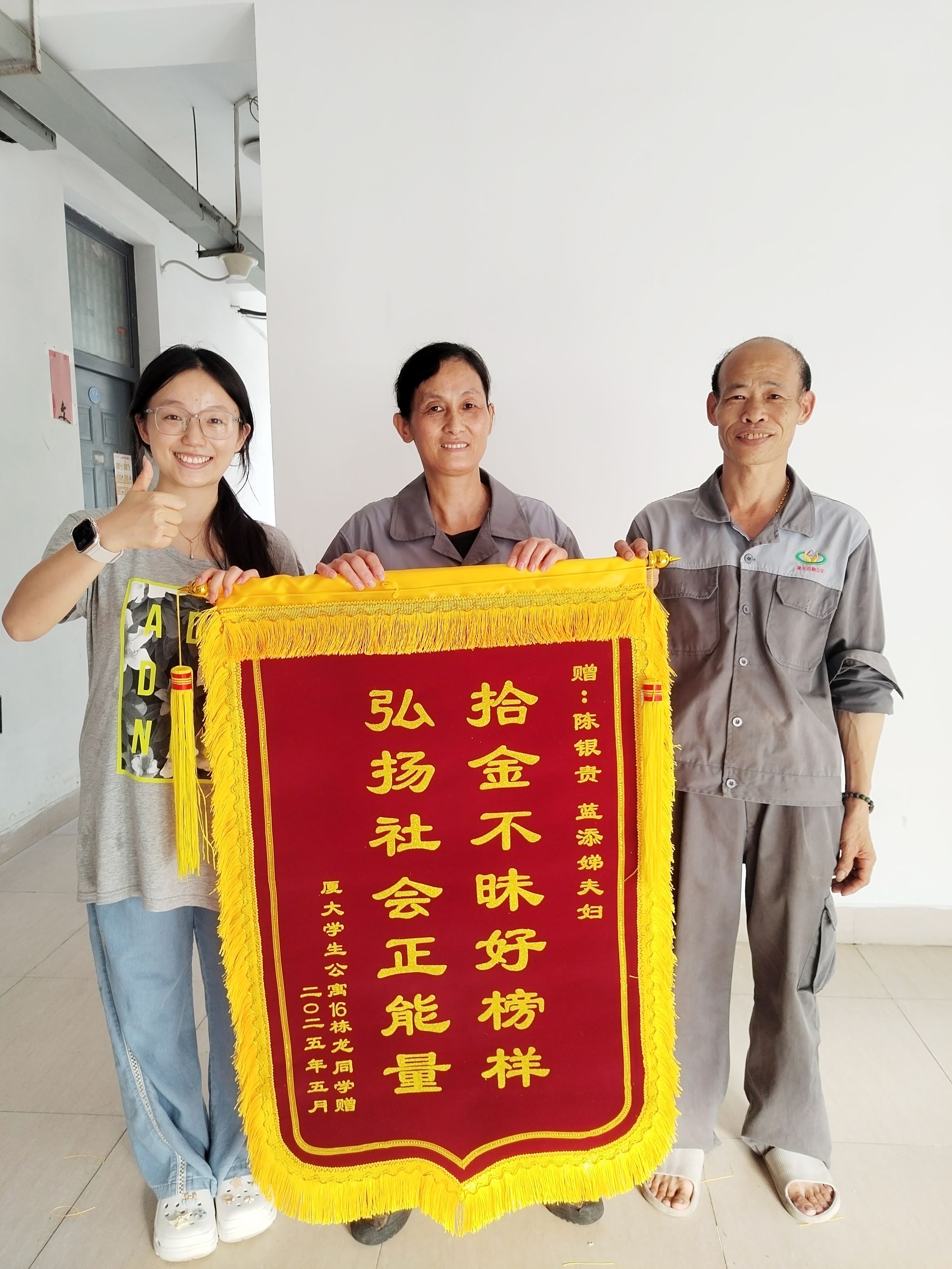 9月21日,海韵物业服务部海韵16号楼的保洁员陈银贵与蓝添娣夫妇,收到了一份特别的荣誉——住在该楼栋的龙同学送来了一面锦旗。锦旗上“拾金不昧好榜样,弘扬社会正能量”十四个金色的大字格外醒目,承载着同学满满的敬意与感谢。