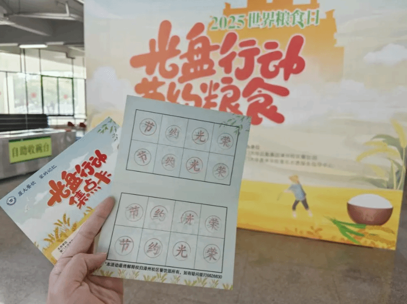 “集齐印章就能兑换餐品!”漳州校区的师生们最近都在为餐盘里的“空白答卷”而努力。10月16日启动为期两周“光盘打卡集章”活动,以“节、约、光、荣”四字印章为媒介,将2000份打卡卡片变成了“节约储蓄卡”,记录着从“被动参与”到“主动践行”的观念转变。