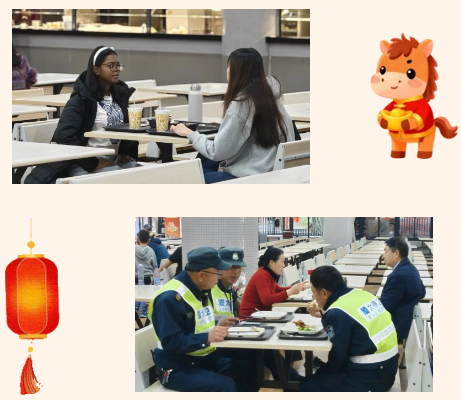 就餐高峰时,各窗口井然有序,家常菜肴与饺子、年糕等年味美食相映生辉。留校学子围坐交谈,值守教师从容就餐,后勤员工温情相伴。他们身份不同,岗位各异,却共同诠释着“坚守”的含义,无论是为学业奋斗,为校园护航,还是为育人倾注心血,都是厦大故事里不可或缺的篇章。一餐暖饭,一场团圆,让所有付出沉淀为温暖的年味,也让每一份坚守,都有了清晰而动人的模样。