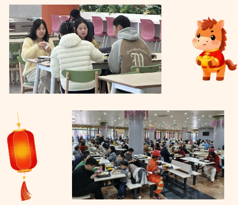 “老师,新年好!”“同学,新春快乐!”一句句暖心的问候,伴着餐盘递到手中,食堂阿姨的温柔笑意,与后厨升腾的烟火气相融,化作校园里最动人的新春图景,治愈每一份异乡的思念。