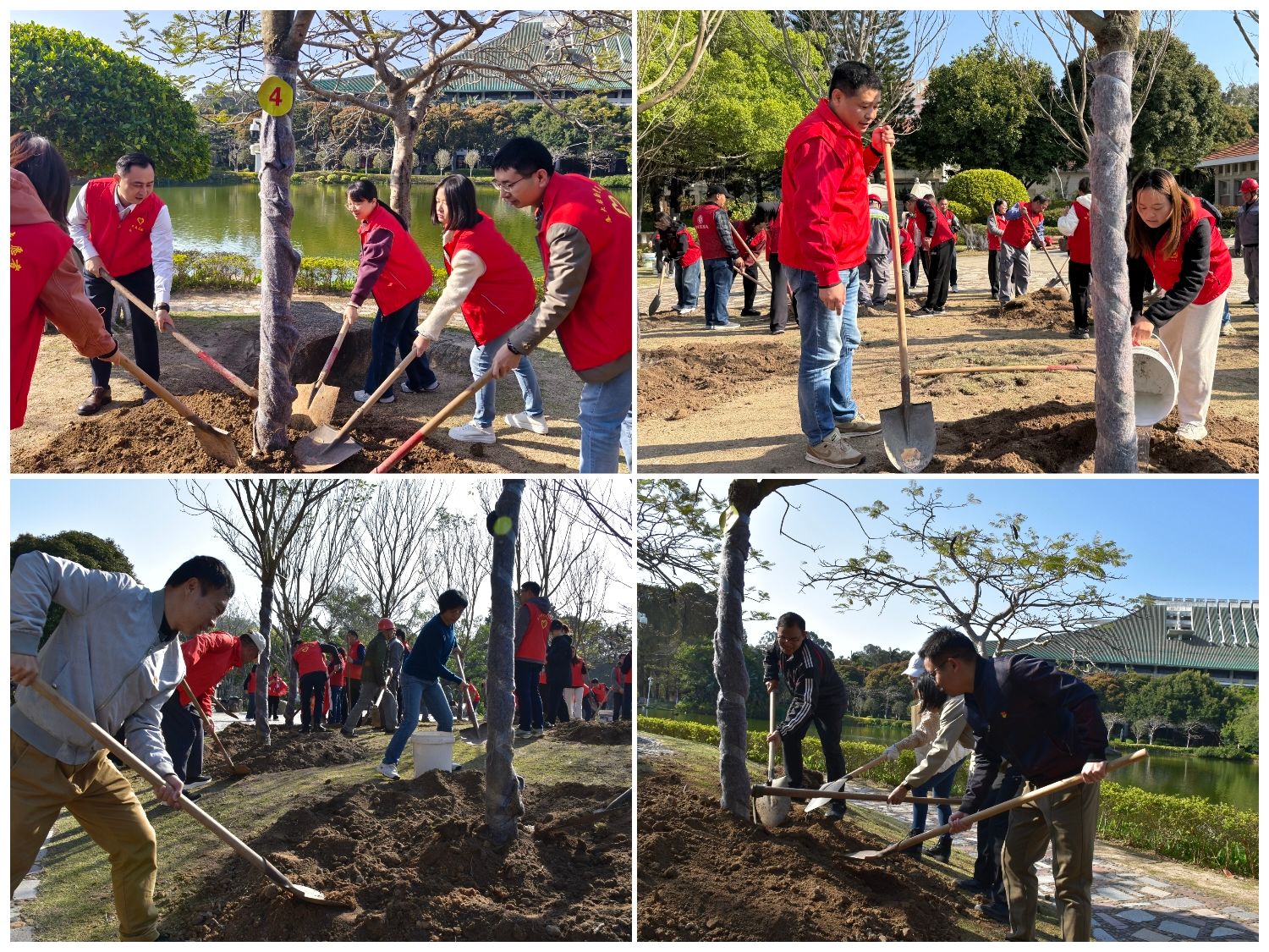 活动现场,党旗飘扬,近百名党员精神饱满、斗志昂扬,按照预先分组奔赴指定区域,迅速投入植树活动中。从挥锹填土到扶正浇水,各环节严谨规范、配合高效。党员们以饱满的热情和十足的干劲完成各项工序,成功栽种了12株绣球风铃木。一株株新栽的树苗在春日校园里迎风挺立,为湖心岛再添一道亮丽的生态景致。