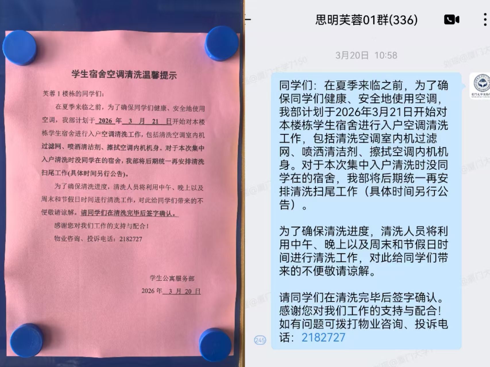 清洗工作开展前,工作人员通过楼栋公告栏张贴温馨提醒、企业微信群发布通告等多渠道,提前告知同学们清洗安排、作业时段等事宜,最大程度减少作业对同学们日常生活的影响。为提升工作效率,工作人员灵活利用中午、晚间、周末及节假日错峰入户清洗;为保障服务质量,每间宿舍空调清洗完毕后,均由同学现场签字确认,形成闭环管理。针对集中清洗时段无人的宿舍,工作人员统一登记备案,后续安排专项补洗,确保清洗工作全覆盖、无遗漏。