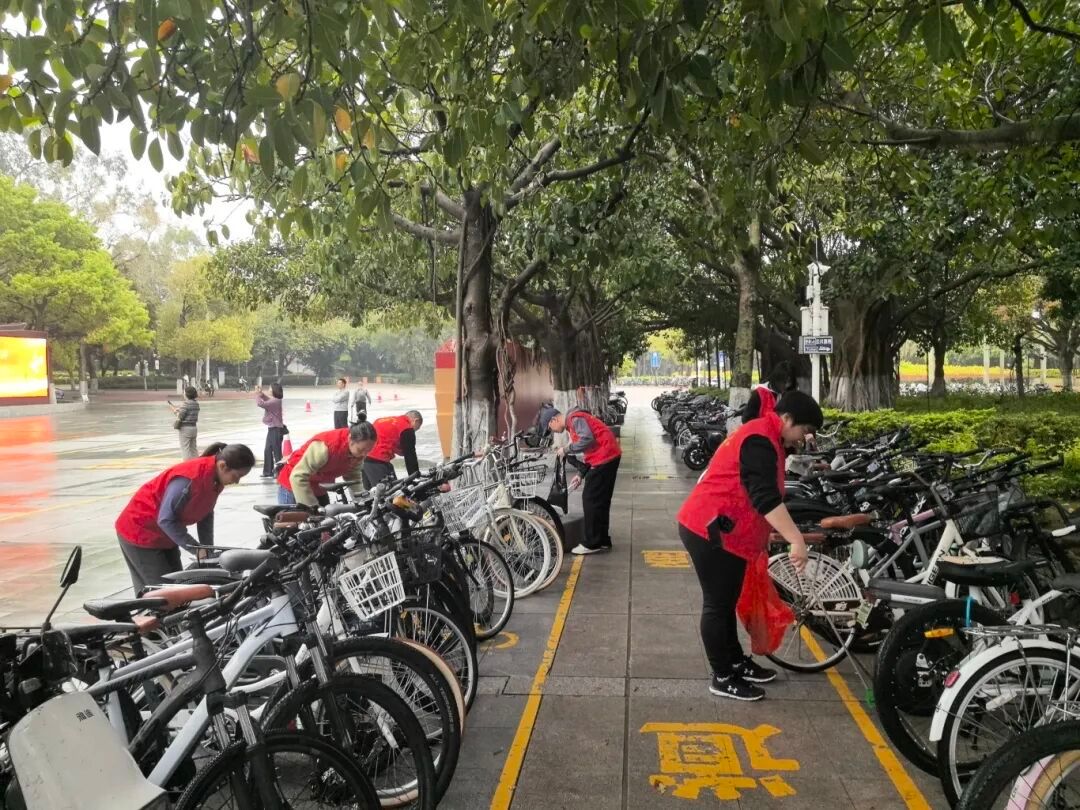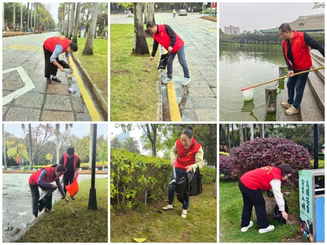 活动现场,全体志愿者身着统一服装,佩戴党徽,精神饱满地投入到清洁工作中。大家分工协作、默契配合,手持清洁工具,对校园主干道路面、绿化带中的垃圾、烟头、掉落的木棉花等进行全面清捡。针对校园公共区域、湖畔步道及水域等重点区域,志愿者们细致排查卫生死角,规范摆放非机动车,切实维护校园环境秩序。