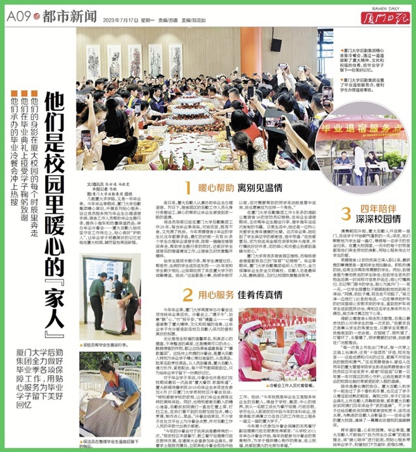 7月17日,《厦门日报》A09版刊发毕业季报道《他们是校园里暖心的“后勤人”》,介绍了厦门大学后勤集团全力做好毕业季各项保障工作,用贴心服务为毕业学子留下美好回忆。全文如下: