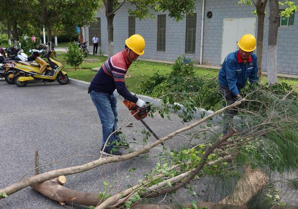 在一期田径场北侧,校园服务部绿化组模拟了道路倒伏树木清障应急演练。抢险人员提前设置好路障,有条不紊检查各类应急设备,齐心协力疏通道路,快速清理枯死树枝、扶正加固倒伏树木。