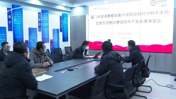 在装车发货前,沙塘镇负责人与厦门大学后勤集团负责人,以及部分学院的老师开展线上视频交流活动,对厦门大学一直以来对张树村的帮扶与支持表示感谢,并就张树村产业发展进行了深入交流。