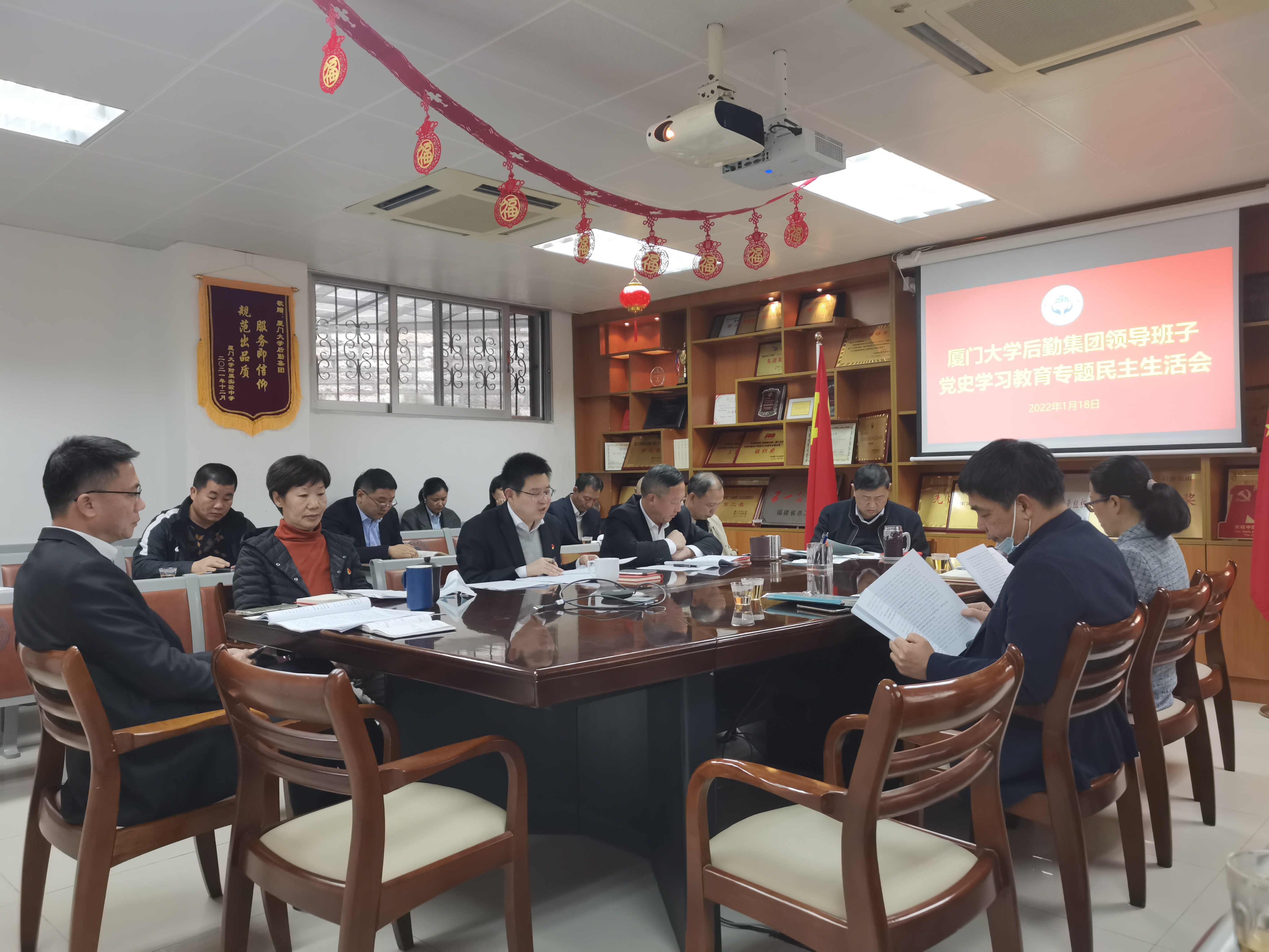 2022年1月18日下午,后勤集团召开领导班子党史学习教育专题民主生活会。厦门大学纪委委员、艺术学院党委书记张必华和厦门大学党史学习教育第五指导组副组长、纪委办副主任邹海燕到会指导,集团领导班子成员杨云良、林公明、邓泽君、陈有亮、王裕民、李启忠参会,集团各单位负责人、党支部书记、工青妇负责人列席会议。会议由集团党委书记杨云良主持。
