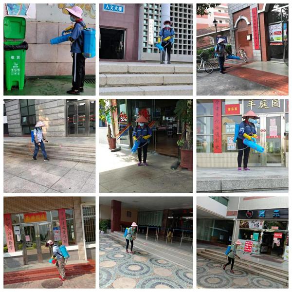 健康观察区外也不轻松:每日凌晨4:00到6:00完成校区道路日常保洁,7:00马不停蹄穿好防护服,冲兑消毒液,然后背负16升、总重量三十多斤的喷壶,手持喷枪,2个小时完成多处人流密集区域的第一轮消毒作业,下午3:30左右,顶着35摄氏度高温,第二轮消毒作业开启……这是蓝瑞敏和道路组同事每天都要完成的工作。“疫情形势比较严峻的时候,消毒次数从每天两人两次增加到每天十二人两次,消杀面积从原本的2500平方米增加到现在约15747平方米。整天跟消毒药水打交道,味道刺鼻,刚开始还比较不适应,脸上的皮肤还会痒,需要清水清洗、抹抹药膏才能缓解,现在啊,都习惯了。”蓝瑞敏笑着说。