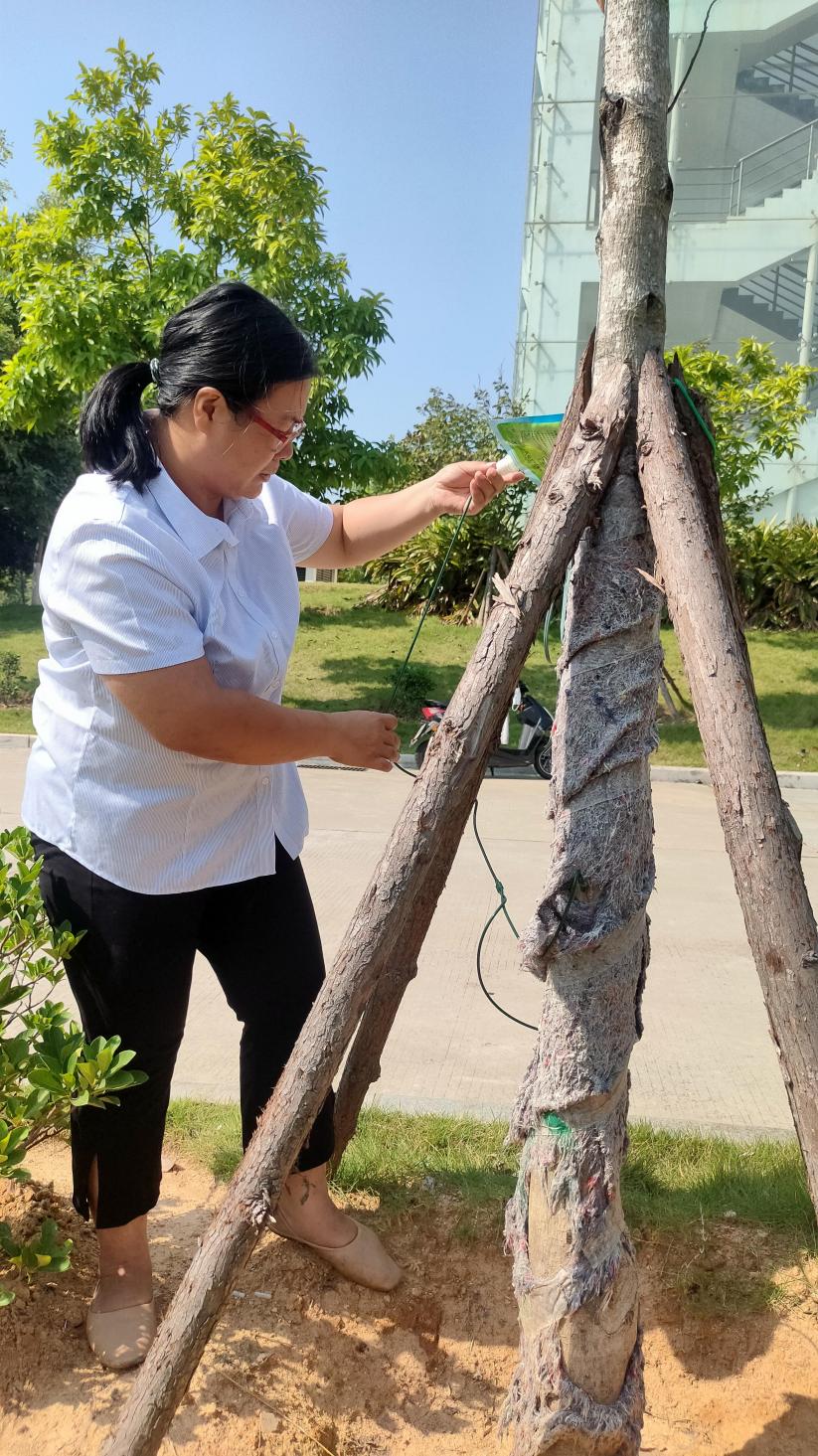 暑假期间,校园绿化负责人许燕青等绿化工作人员除了给苗木浇水、检查虫害等常规任务以外,还需要对今年新种植的苗木和存在安全隐患的苗木特别的注意护养。