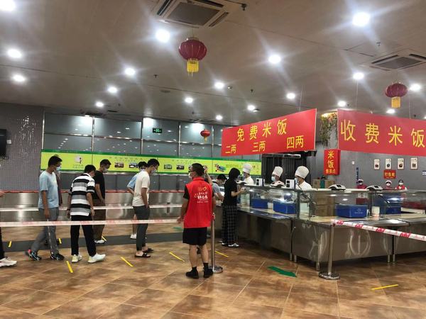校团委协调各学院,每个餐厅安排4-6名学生志愿者帮忙体温检测和进出、取餐引导。