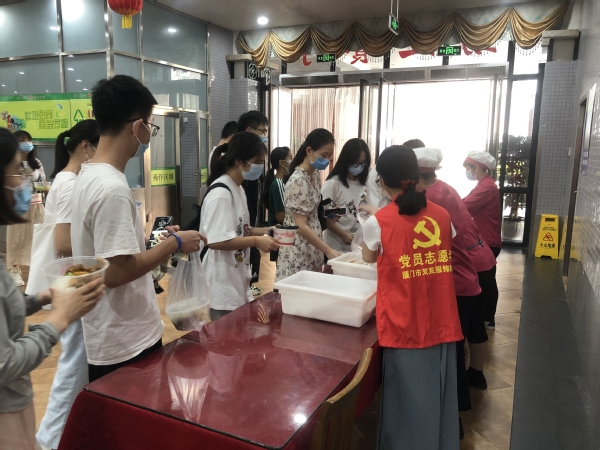 党支部包干餐厅,党员志愿者全力支援。为了缓解餐厅人员不足,后勤集团党委统筹协调,堂食第一天,仅思明校区本部,运输党支部、本部党员支部、综合党支部、物业党支部、南强后勤党员支部就派出62人次党员志愿者,分别包干支援勤业餐厅、芙蓉餐厅、南光餐厅、海滨餐厅、公寓一期餐厅、公寓二期餐厅,帮助餐厅引导师生有序取餐。